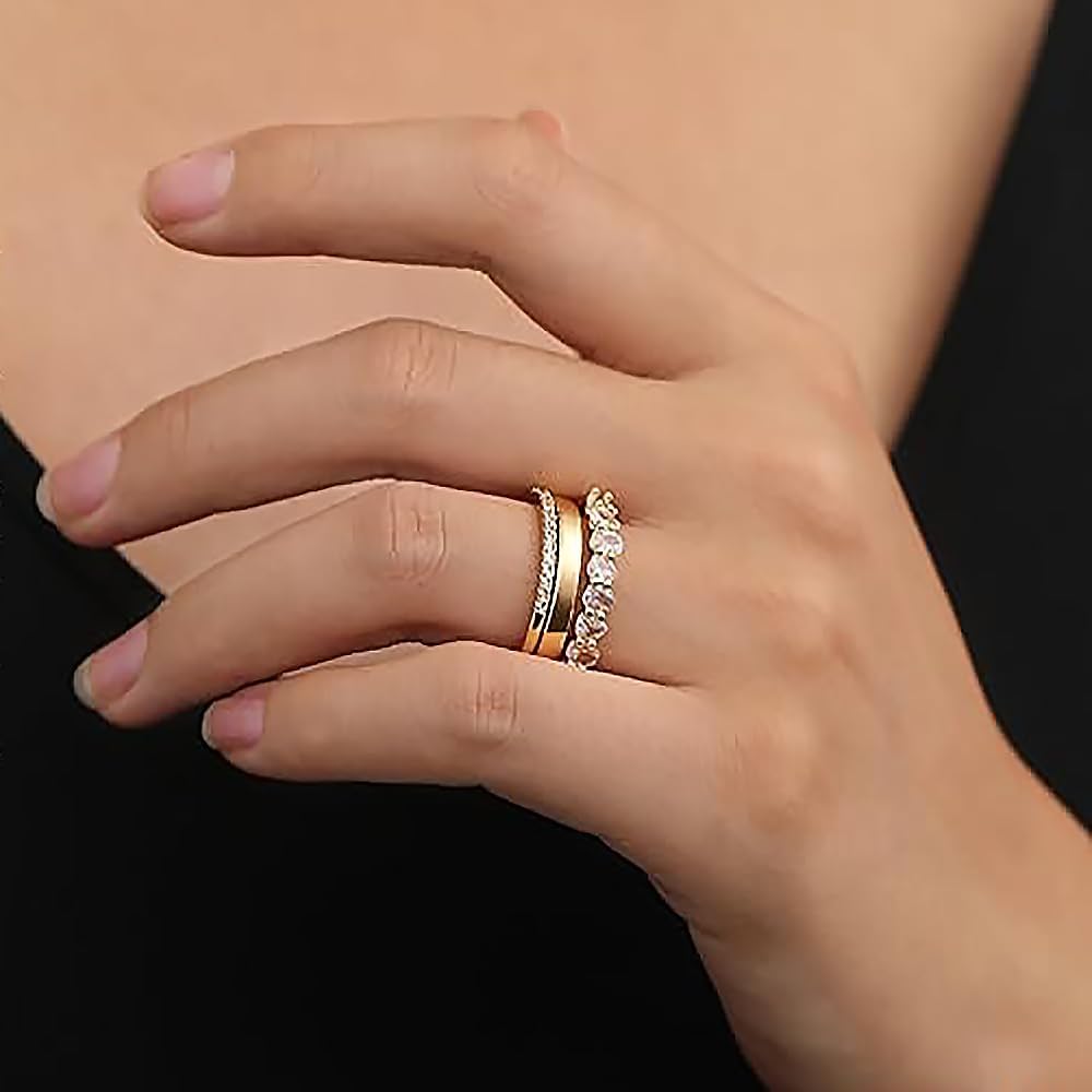 - 1. This rhinestone gold ring we have designed two different styles, one is a very shiny and fashionable ring set, which contains three different rings, folded together very personalized, you can also wear separately, no matter what clothes you wear, it can be bright and attract attention.