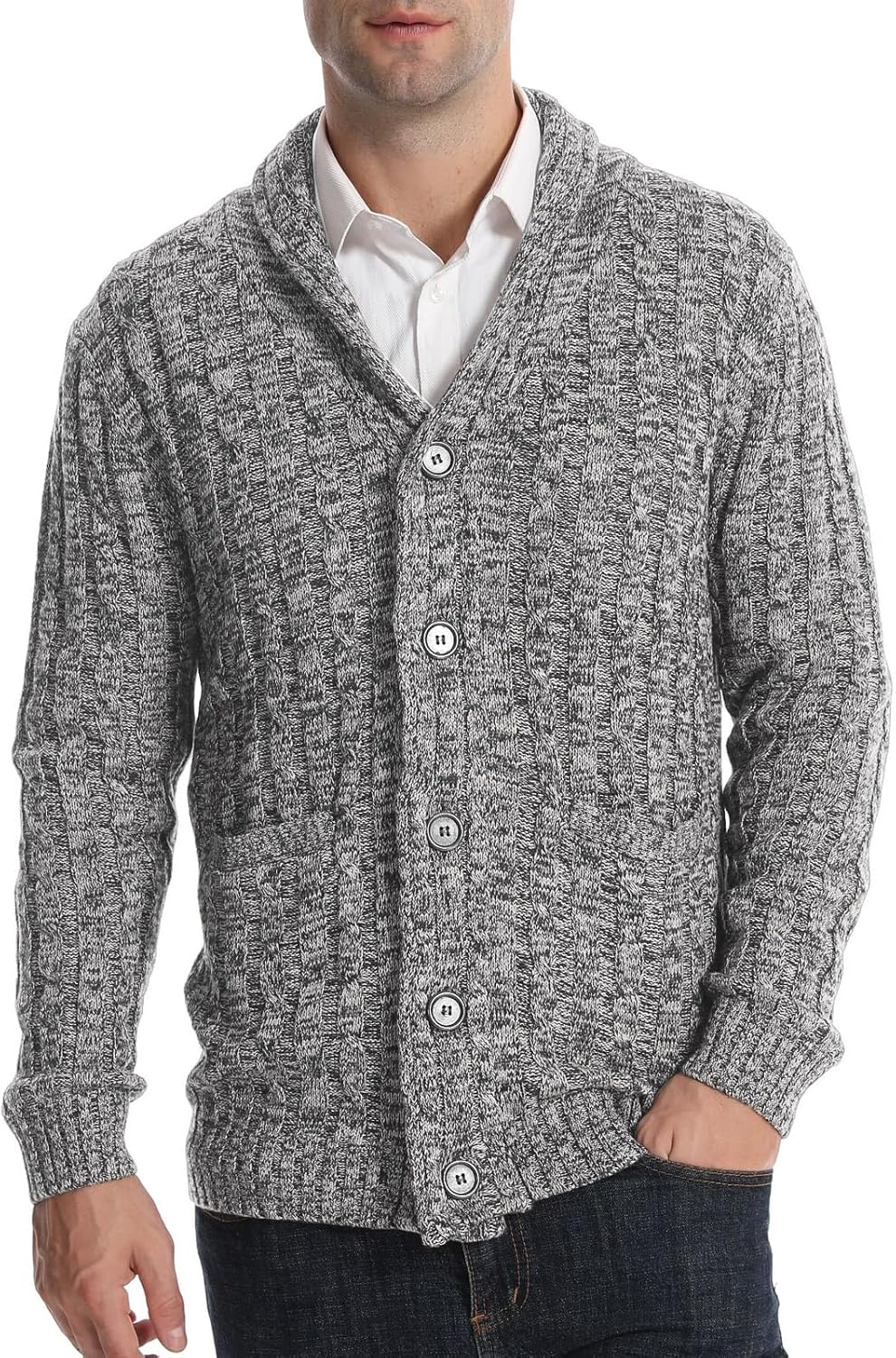 Men Cardigan Sweater Cable Knitted Shawl Collar Cardigans for Men V Neck Long-Sleeve Button-Down Slim Fit Sweater