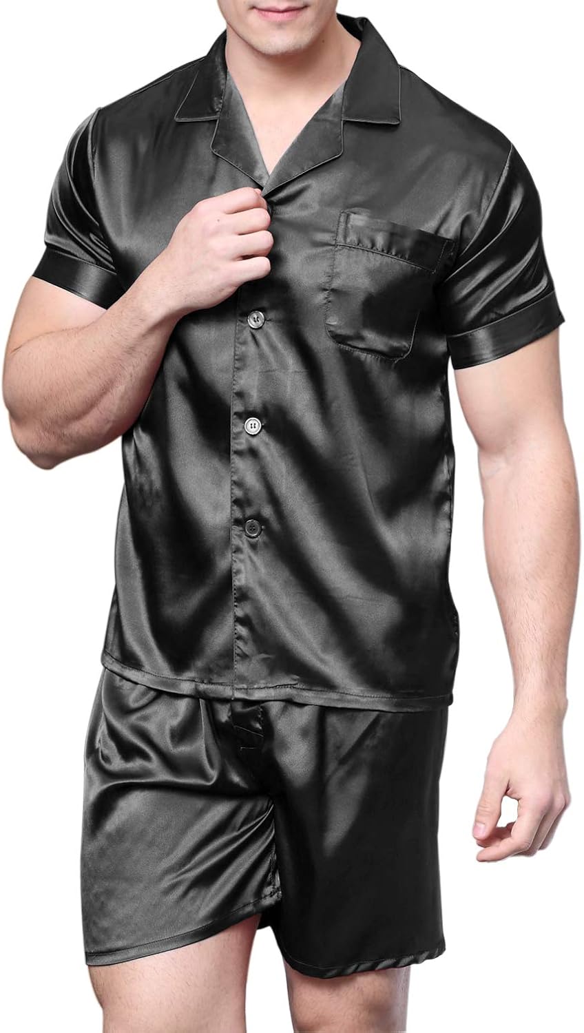 Men Satin Pajamas Short Button-Down Pj Set Sleepwear Loungewear