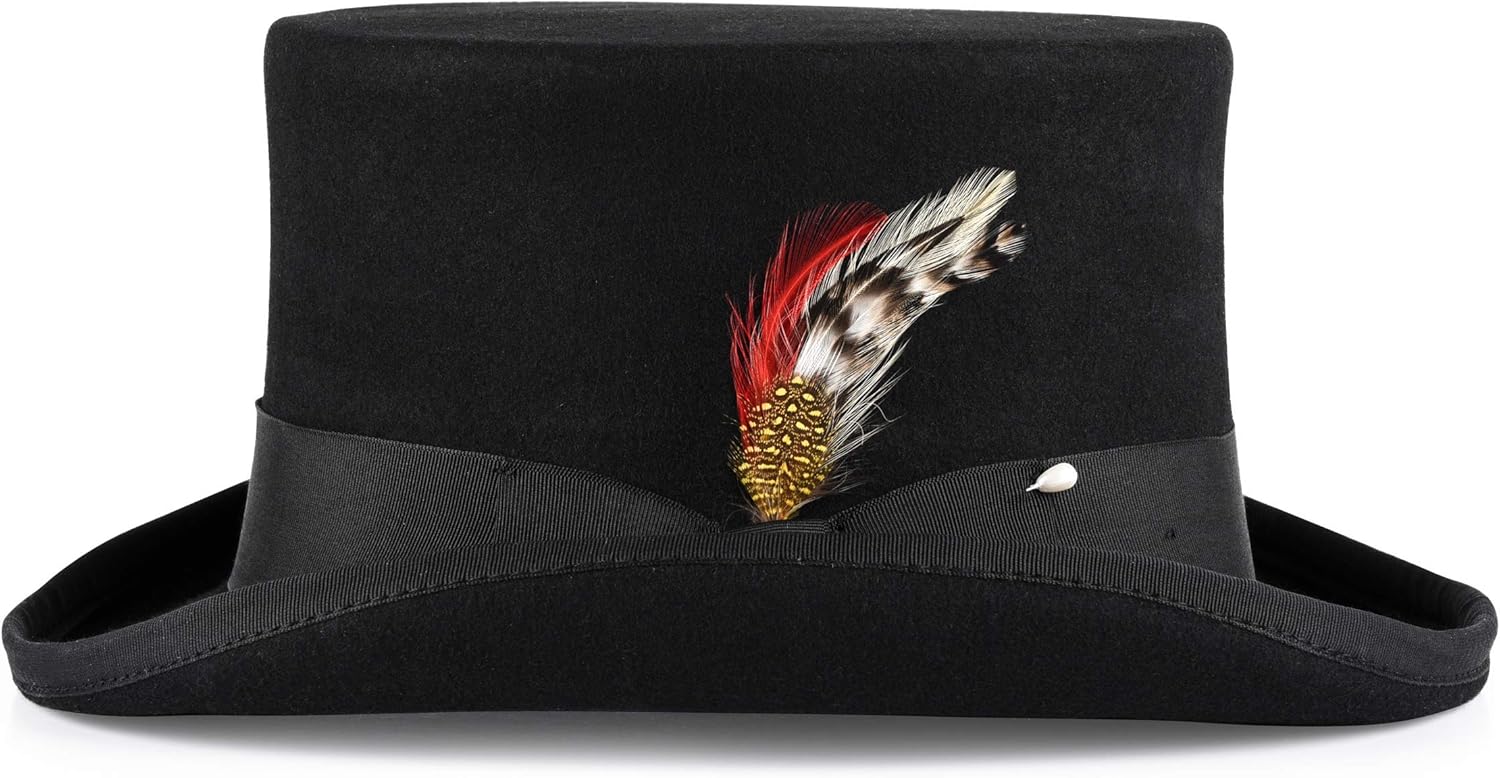 - COMFORT MEETS QUALITY: Our elegant top hat is made from 100% wool, providing both comfort and durability. The inside construction of this men’s felt top hat consists of a leather band and internal silver satin lining designed to wick away excess moisture, while also maintaining the ideal temperature for your head.