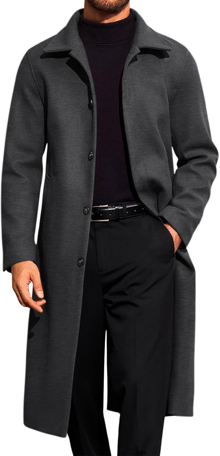 - Stylish Design: Fall winter long trench coat for men, it features with a single-breasted front, hide button closure, lapel collar, sturdy buttons, two side slant pockets and one inner pocket, this fashion pea coat exudes sophistication. The modern fit and calf-length provide a polished silhouette, perfect for both casual and semi-formal occasions
