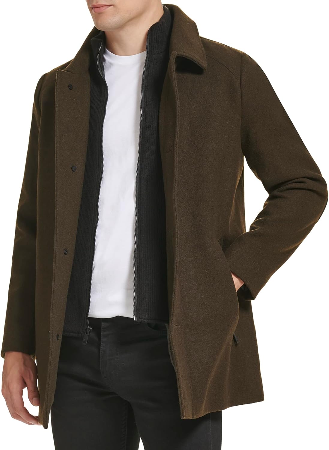 - Features: Wool, zipper detail at collar, single breasted button front, car coat, quilted poly filled lining, outerwear coat