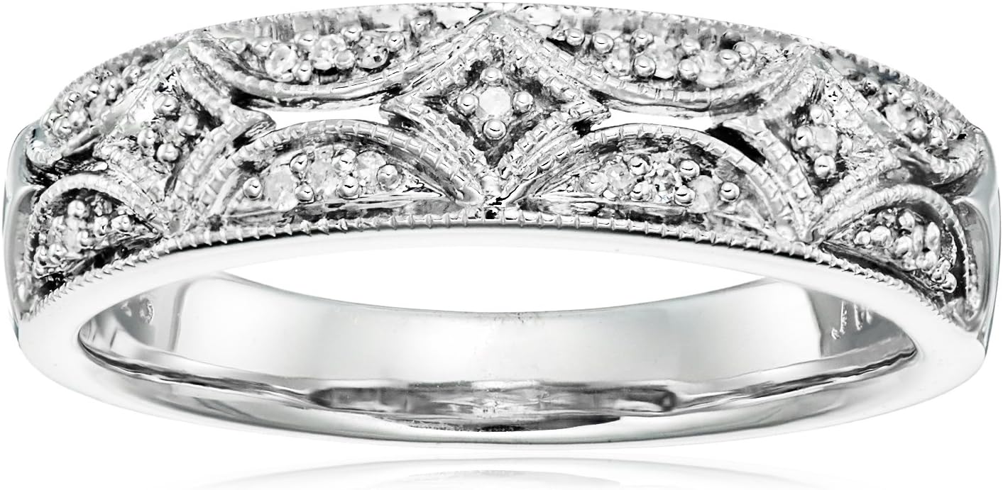 - STYLE: Elegant sterling silver milgrain edged band with a 3.3mm width shank set with 0.05 cttw diamond accents in a delicate pattern