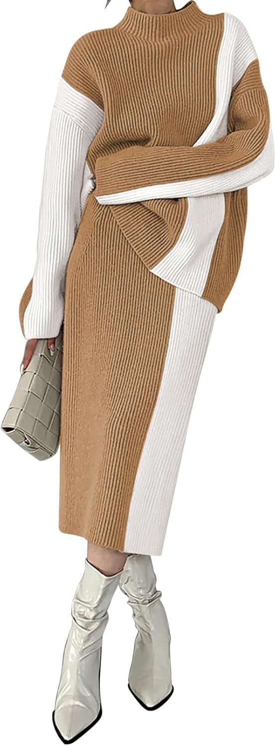 Women’s 2 Piece Outfits 2025 Fall Winter Sweater Skirt Set Long Sleeve Oversized Top High Waist Color Block Dress